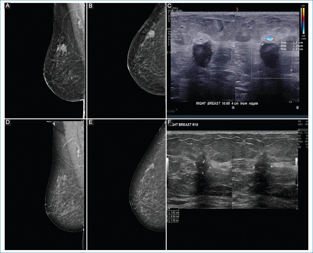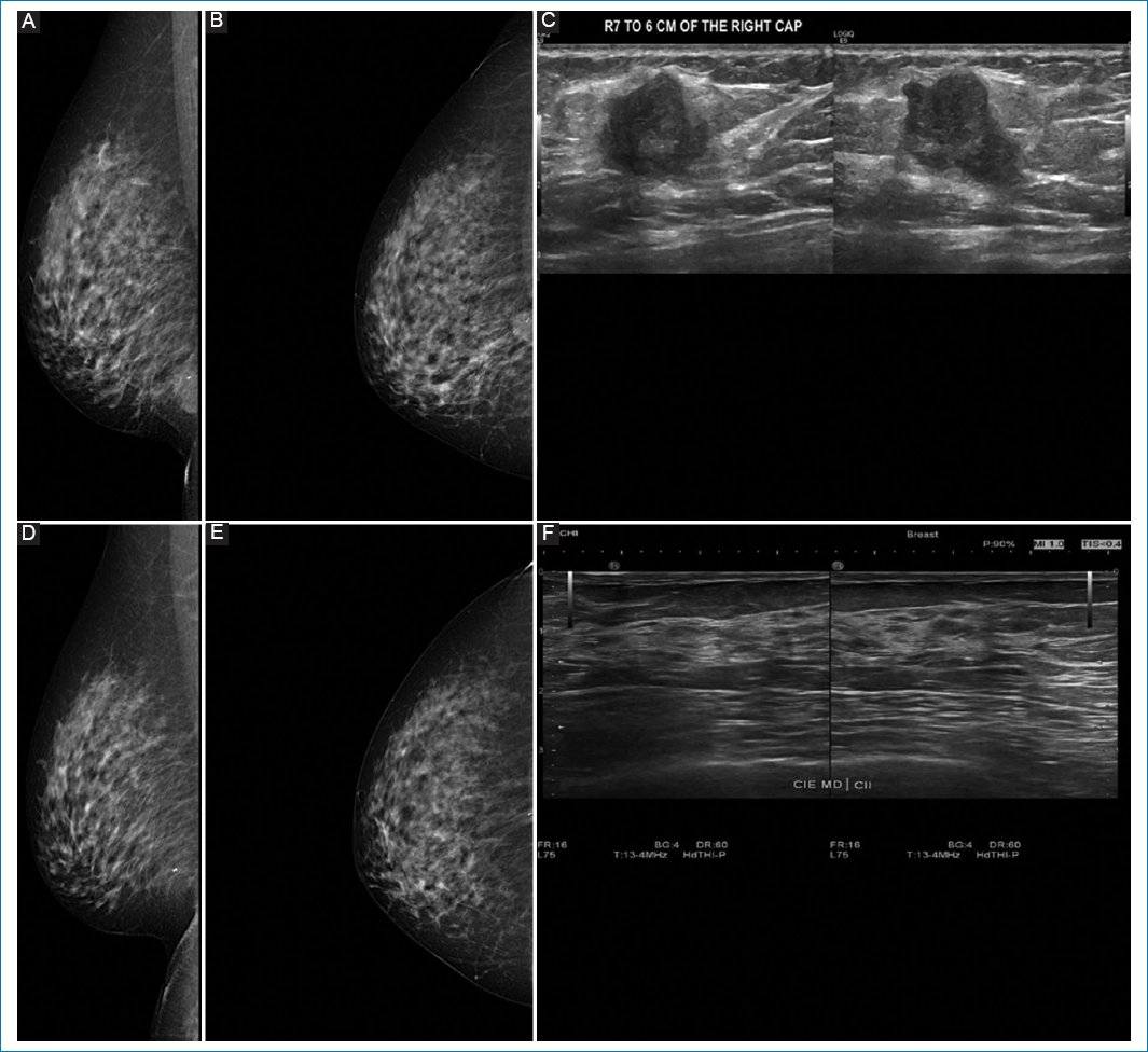 Figure 3. A-C: pre-neoadjuvant images. D-F: post-neoadjuvant images. 41-year-old woman diagnosed with right breast cancer, clinical stage IB by T1cN0M0, Luminal B with low hormone receptor expression, estrogen receptor 0%, PR 5%, human epidermal growth factor receptor 2 not amplified (Silver in situ hybridization) KI67 80%. A and B: shows pre-neoadjuvant mastography, with irregular nodule, in lower inner quadrant, showing intratumoral clip. C: ultrasound same patient with irregular nodule in R7 at 60 mm from the nipple. D and E: show mastography with clip, no nodule is visualized. F: breast ultrasound in R7 at 60 mm from the nipple, without presence of nodule. Images correspond to complete pathologic response corroborated by pathology.