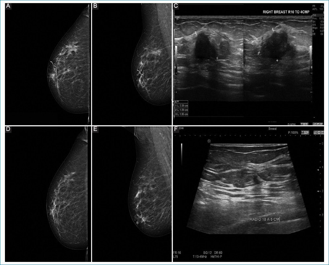 Figure 2. A-C: pre-neoadjuvant images. D-F: post-neoadjuvant images. 64-year-old patient with diagnosis of infiltrating ductal carcinoma of the right breast, clinical stage IIB, triple negative. A and B: pre-neoadjuvant mastography specimen with irregular nodule in upper outer quadrant. C: ultrasound specimen with irregular nodule in R10. D and E: correspond to the mastography. F: ultrasound showing a nodule with partial response to treatment and the presence of intratumoral clip.
