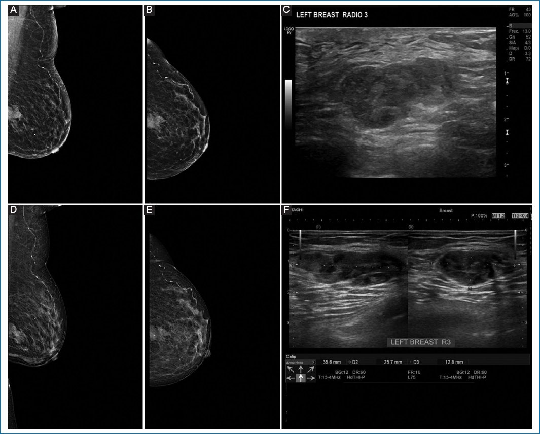 Figure 1. A-C: pre-neoadjuvant images. D-F: post-neoadjuvant images. 51-year-old woman diagnosed with left breast cancer, clinical stage IIA by T2N0M0, Luminal B, estrogen receptor 60%, PR 90%, with human epidermal growth factor receptor 2 overexpressed, Ki67 45%. A and B: pre-neoadjuvant mastography specimen, with irregular nodule, in upper outer quadrant. C: ultrasound same patient with irregular nodule in R12 at 50 mm, from the nipple. D and E: mastography. F: ultrasound showing a reduction > 20%, which corresponds to partial response.