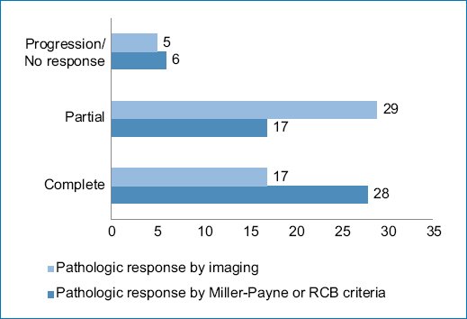 Pathologic response by imaging was classified as partial in 55.8% of cases (Figs. 1 and 2), complete in 34.6% (Figs. 3 and 4), stable (Fig. 5), or progressive disease in 9.6%. By pathology (RCB), response was complete in 53.8%, partial in 34.6%, and progressive in 11.5% (Fig. 6).
