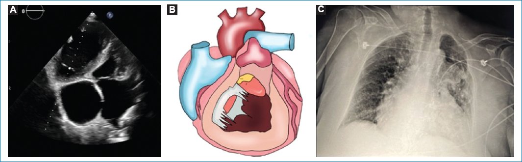Figure 1. A: four-chamber view on transthoracic echocardiography: showing dilation of both atria, atrial septal defect, hypertrophic interventricular septum, and a small left ventricle chamber due to right ventricle dilation. B: illustration of cardiac remodeling due to congenital heart disease. C: radiography with data of pulmonary congestion and cardiomegaly.