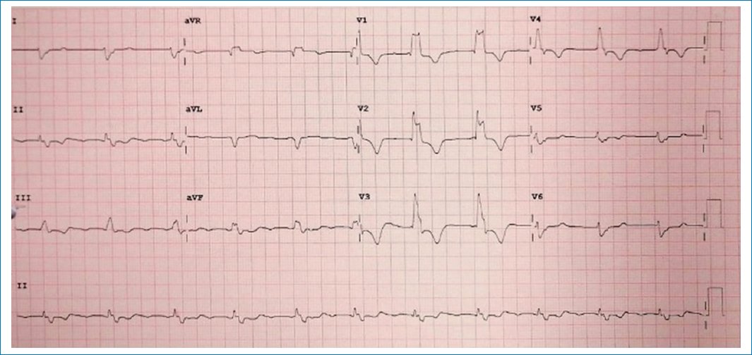 In the examination, there was a remarkably generalized pitting edema of 1 year of evolution Godett 4+, with hot and painful erythema in the lower hemiabdomen and lower limbs of 2 weeks of evolution, and peribuccal cyanosis. The pulse rate was 65 beats/min; blood pressure of 137/75; respiratory rate of 16/min, and oxygen saturation of 75%. Complementary diagnostic studies were performed to complete the clinical assesment (Fig. 1). The electrocardiogram showed a non-sinus rhythm (Fig. 2), with a right bundle branch block and atrial tachycardia with a 3rd grade atrioventricular (AV) block, with non-specific intraventricular conduction alterations and secondary ventricular alterations. The echocardiogram showed chronic changes with cardiac remodeling characterized by a remarkable dilatation of both atria and right ventricle, and a hypertrophic interventricular septum.