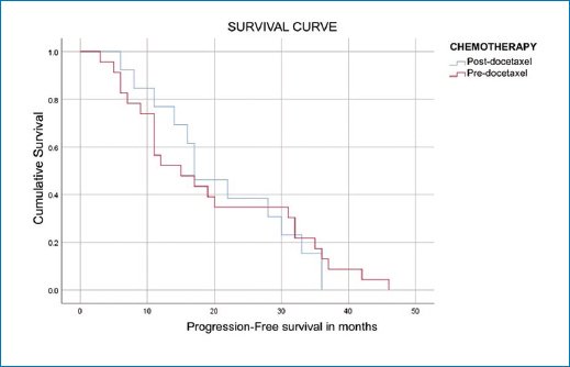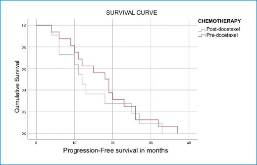 Among the 27 (43%) patients treated with abiraterone, 16 (59%) had not received prior chemotherapy (pre-docetaxel), whereas 11 (41%) had received chemotherapy before abiraterone administration (post-docetaxel). Patients from the pre-docetaxel group achieved a mean progression-free survival (PFS) of 17.938 months; 80% reached PFS at 10 months, gradually decreasing to 20% at 26 months. Minimum survival was 4 months and maximum survival was 37 months. Patients from the post-docetaxel group achieved a mean PFS of 15 months; 80% reached PFS at 6 months, gradually decreasing to 20% at 25 months. Minimum survival was 4 months and maximum survival was 33 months. PFS results for both groups (pre- and post-docetaxel) are shown in table 4 and figure 1.