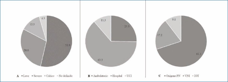 Figura 1. A: porcentaje de casos con enfermedad leve, severa o crítica*, n = 1,933. B: proporción de casos bajo tratamiento ambulatorio, hospitalario o bien en la unidad de cuidados intensivos (UCI), n = 1,138. C: porcentaje de casos que requirieron oxígeno suplementario por medio de puntas nasales (PN), ventilación mecánica no invasiva (VMNI) o intubación orotraqueal (IOT), n = 967.